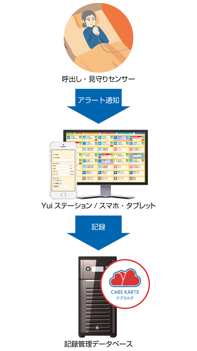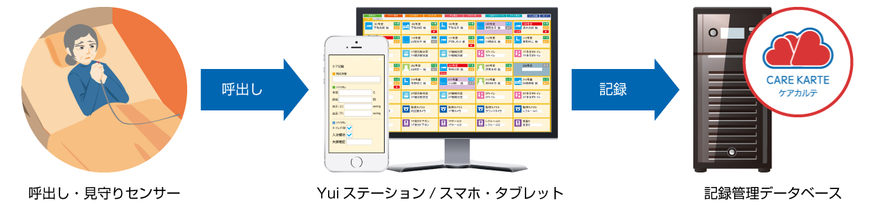 Yuiコールは、単独でもナースコールからの呼出し履歴(呼び出された時間・居室の番号等)を自動的にデータベースに記録します。介護記録ソフトとの連携では、連携する各社の介護記録にも同時にその呼出し履歴を記録することができます。