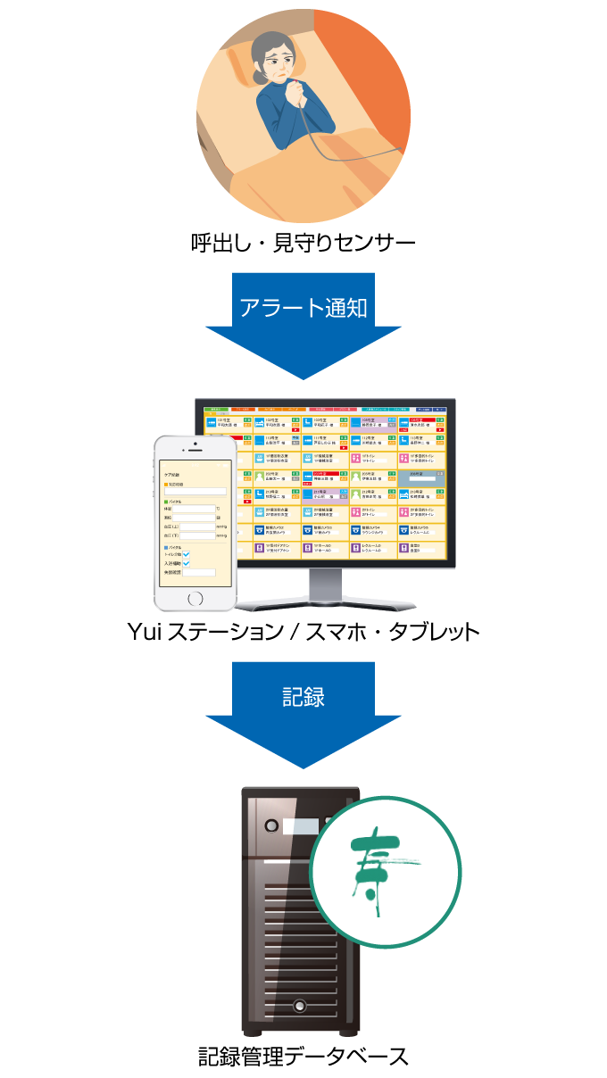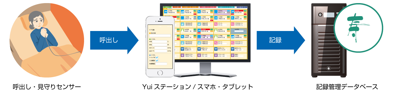 Yuiコールは、単独でもナースコールからの呼出し履歴(呼び出された時間・居室の番号等)を自動的にデータベースに記録します。介護記録ソフトとの連携では、連携する各社の介護記録にも同時にその呼出し履歴を記録することができます。