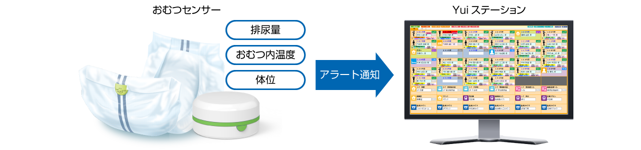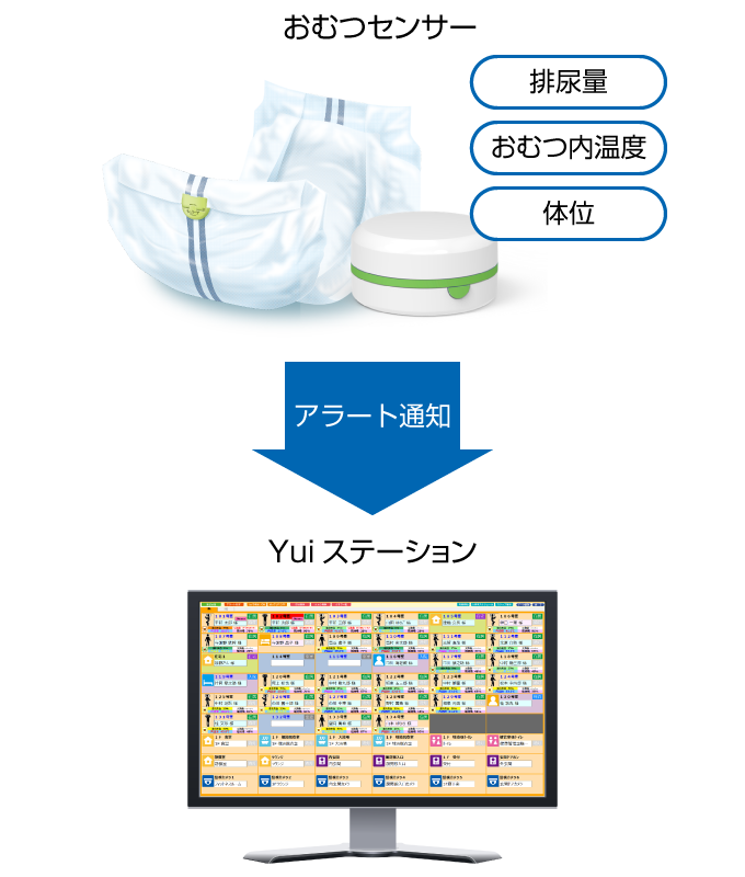 おむつセンサーから、排尿量・おむつ内の温度・着用者の体の向き(体位)などを検知し、そのデータを集中見守り管理システム「Yuiステーション」に自動で送信します。