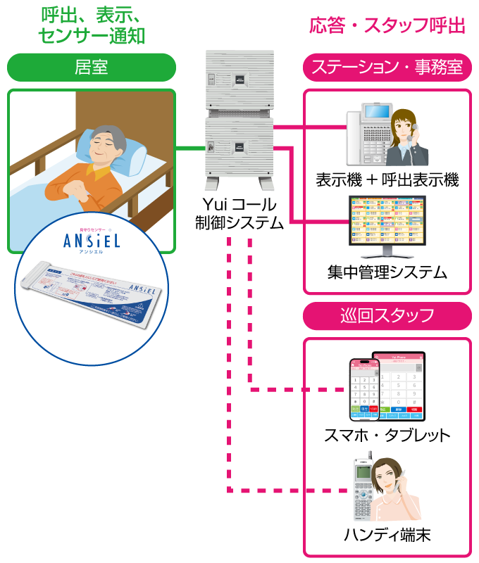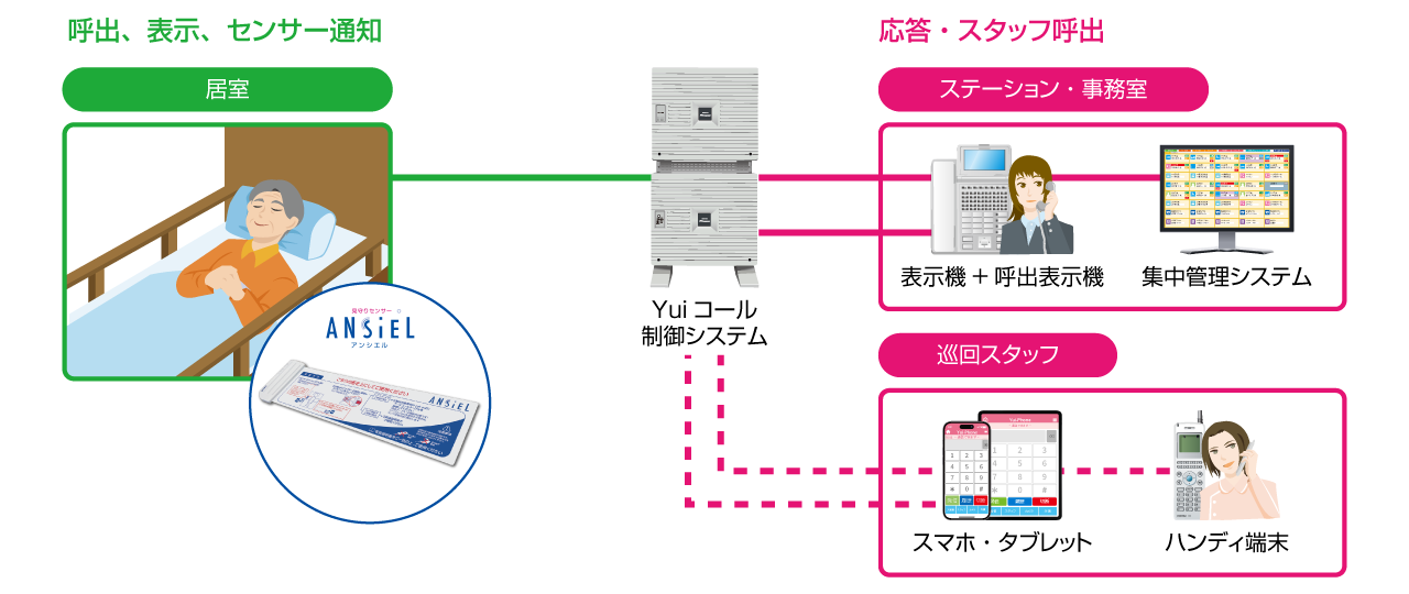 「ANSIEL」と連携させることで、ベッド上のアラート通知を電話機やスマホ・タブレット、PHSハンディナースで受けられるようにすることが可能です。
