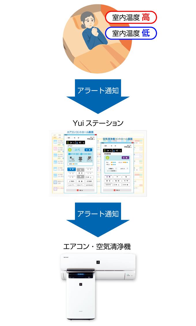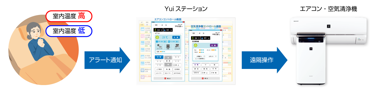 そこで最適なのが、シャープ製のエアコン・空気清浄機と連携したYuiコールシステム。全居室・共用部の居室環境をリアルタイムで見守り、空調機器を遠隔で操作することが可能。居室ごとに空調機器の温度や運転モードの切り替えも行えます。